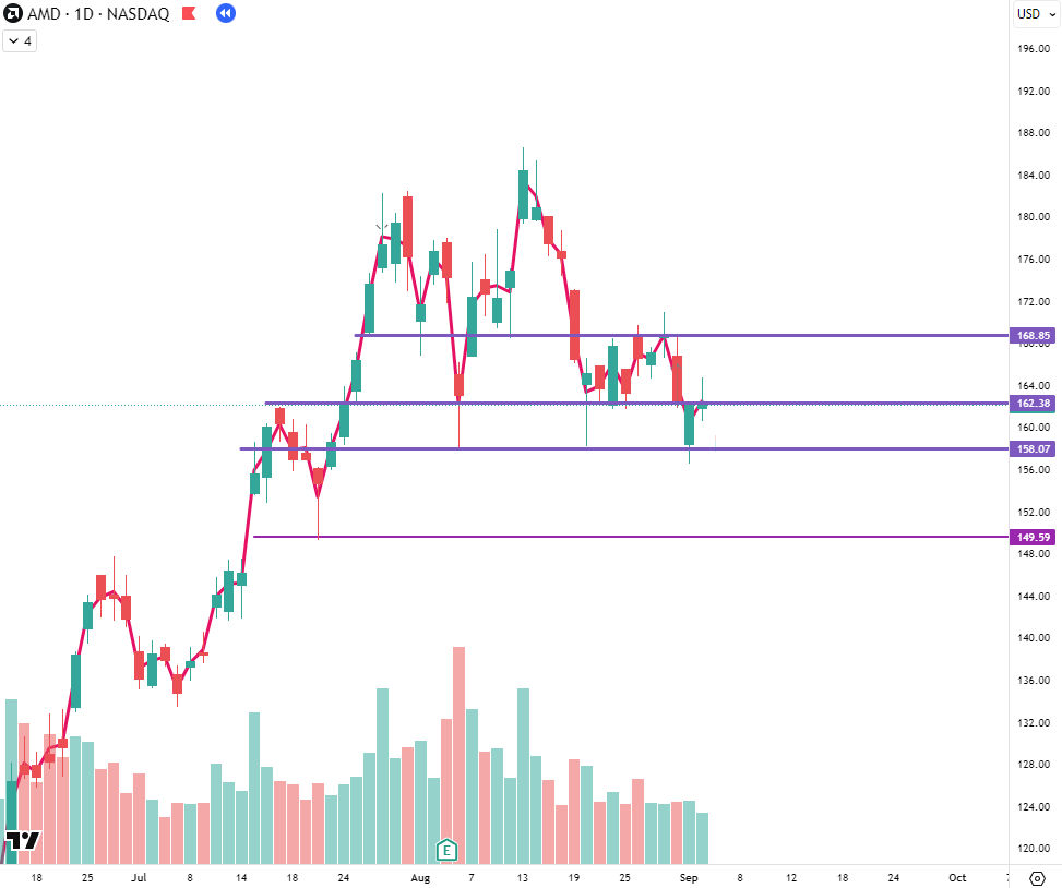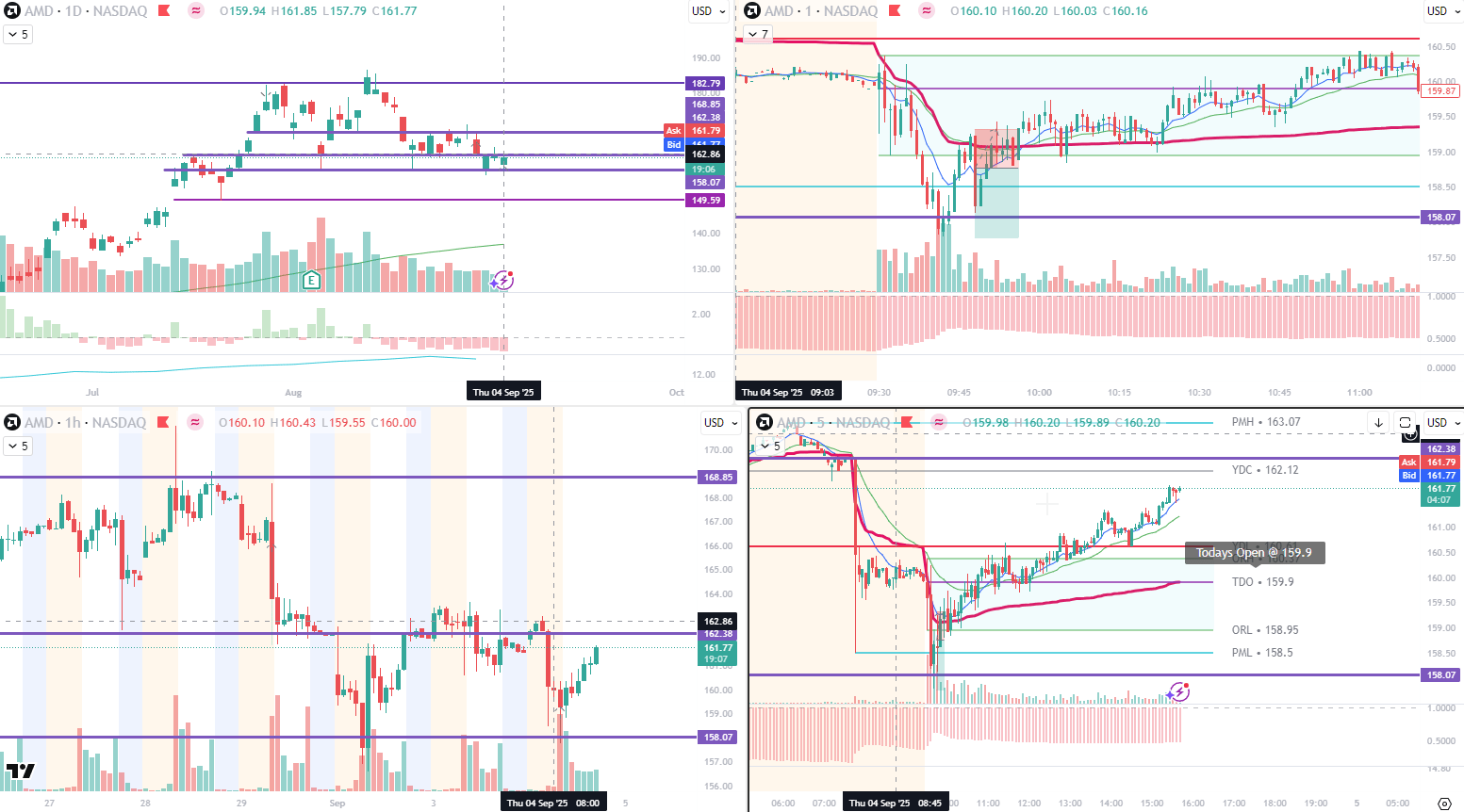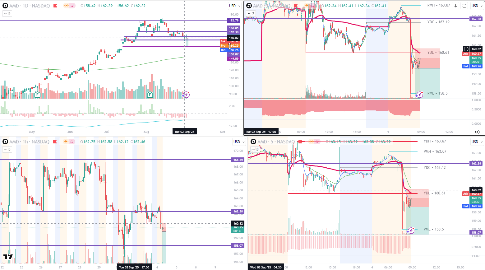What I am watching: AMD is trying to defend 158, but noting that the pops and momentum coming off the level is becoming weaker and weaker. We are now under PDL. Watching for a retest and move to the downside.