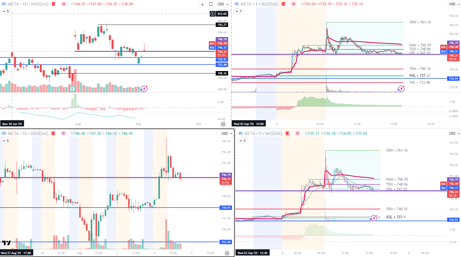 What I am watching: Looking at META to either the upside or the downside. Had bullish momentum in the premarket, but seems to be fading the move. If the market weakens, can look for a break below 747 and a move back down towards PDH.