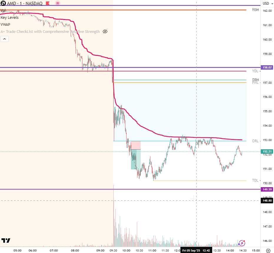 Trade Thesis: AMD was gapping down while the market was strong. It had been showing little momentum off the 158 level and once it received news that it was down graded it started selling off and opened below the level