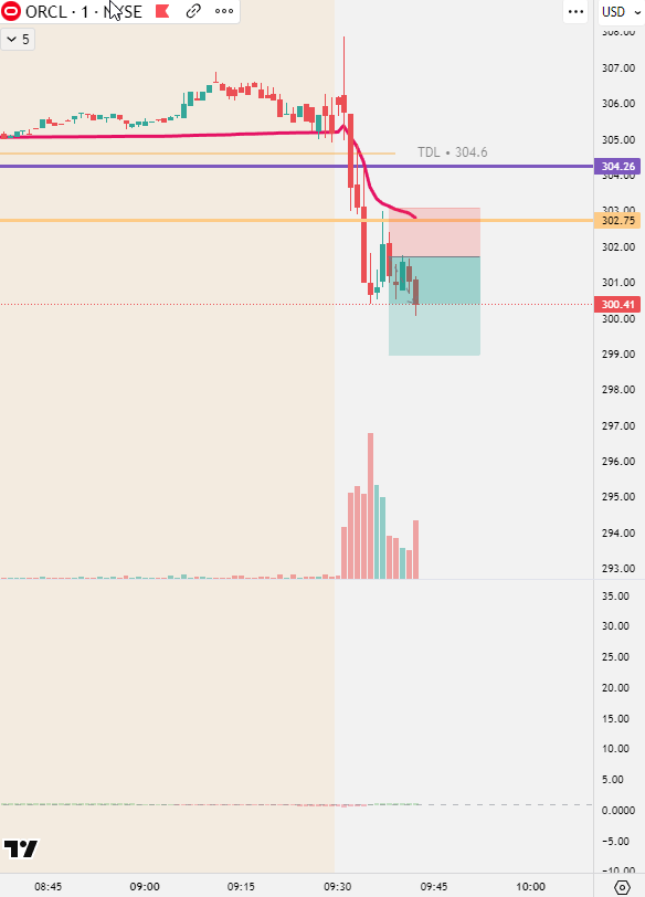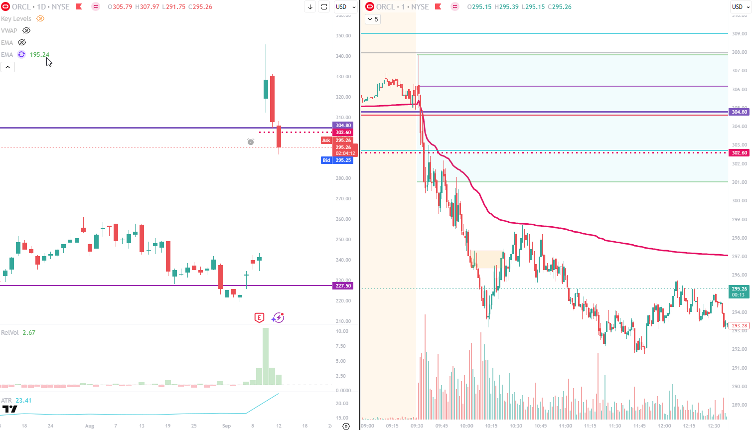 Trade Thesis: ORCL has a gap up of almost 30% and it continued to rally into the session on Wednesday, after red day yesterday I was watching the premarket low to see if we can get below and continue to fill the gap.