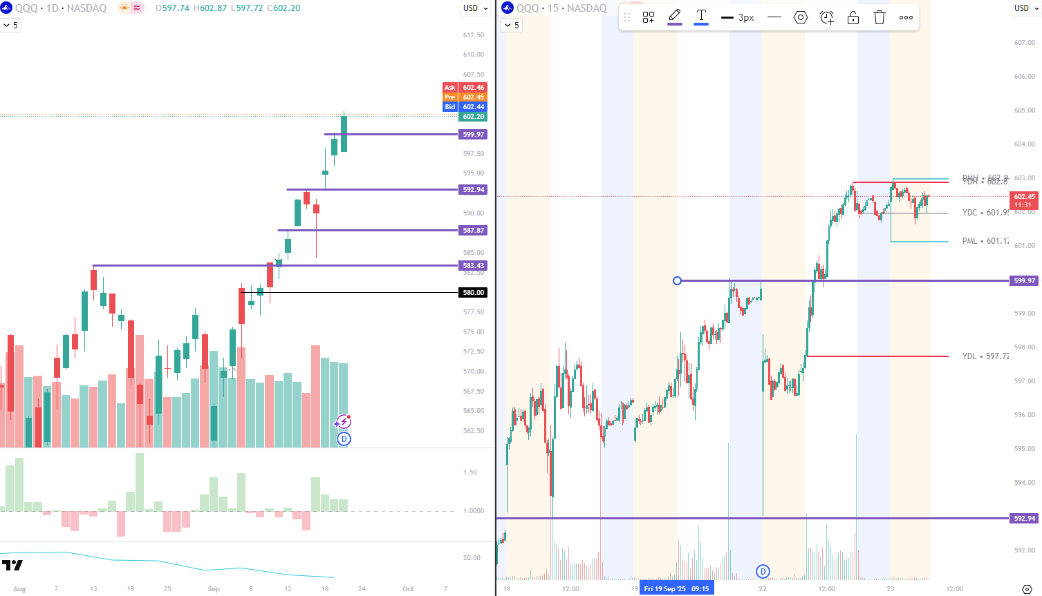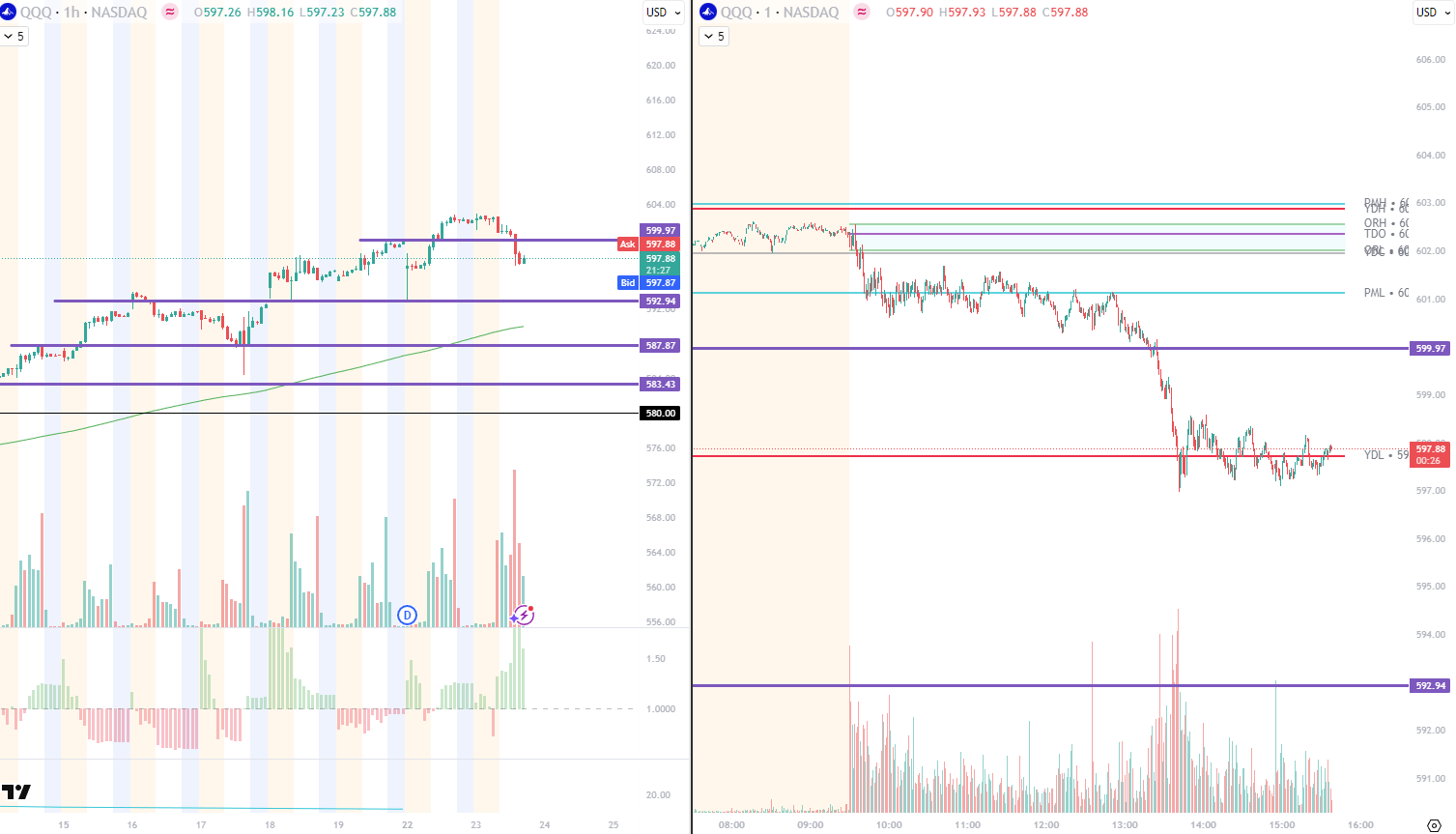 What I am watching: Also a fairly tight range in the PM. Watching 600 and PDH as the levels on QQQ. If we defend 600, could be a nice PB long for a move back up into ATH.