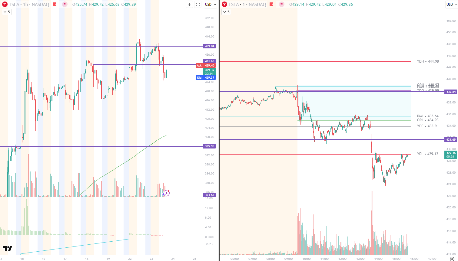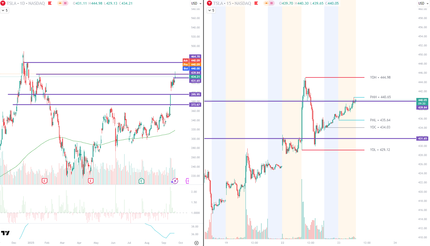 What I am watching: TSLA best setup would be above PDH, but also watching a PMH which lines up with the 440 level. This could rip again, so trying to be on the side of momentum.